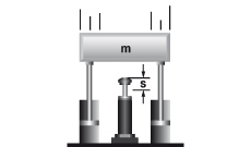 | m = 100 kg F = 2000 N vD = v = 2 m/s s = 0,1 m W1 = 200 Nm W2 = 200 Nm W3 = 400 Nm me = (2 · 400) / 4 = 200 kg Formule: me = (2 · W3) / vD2 |